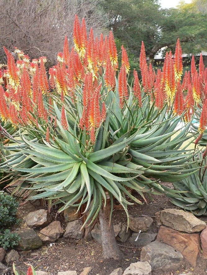 When this very big, stemmed, feature cultivar opens its pastel orange-to-yellow flowers the whole garden gets a face lift. This happens just past midwinter and birds and bees go crazy for the bountiful new food source. Bountiful is an apt description for the masses of colourful racemes that crown the big rosette of this aloe from side to side.